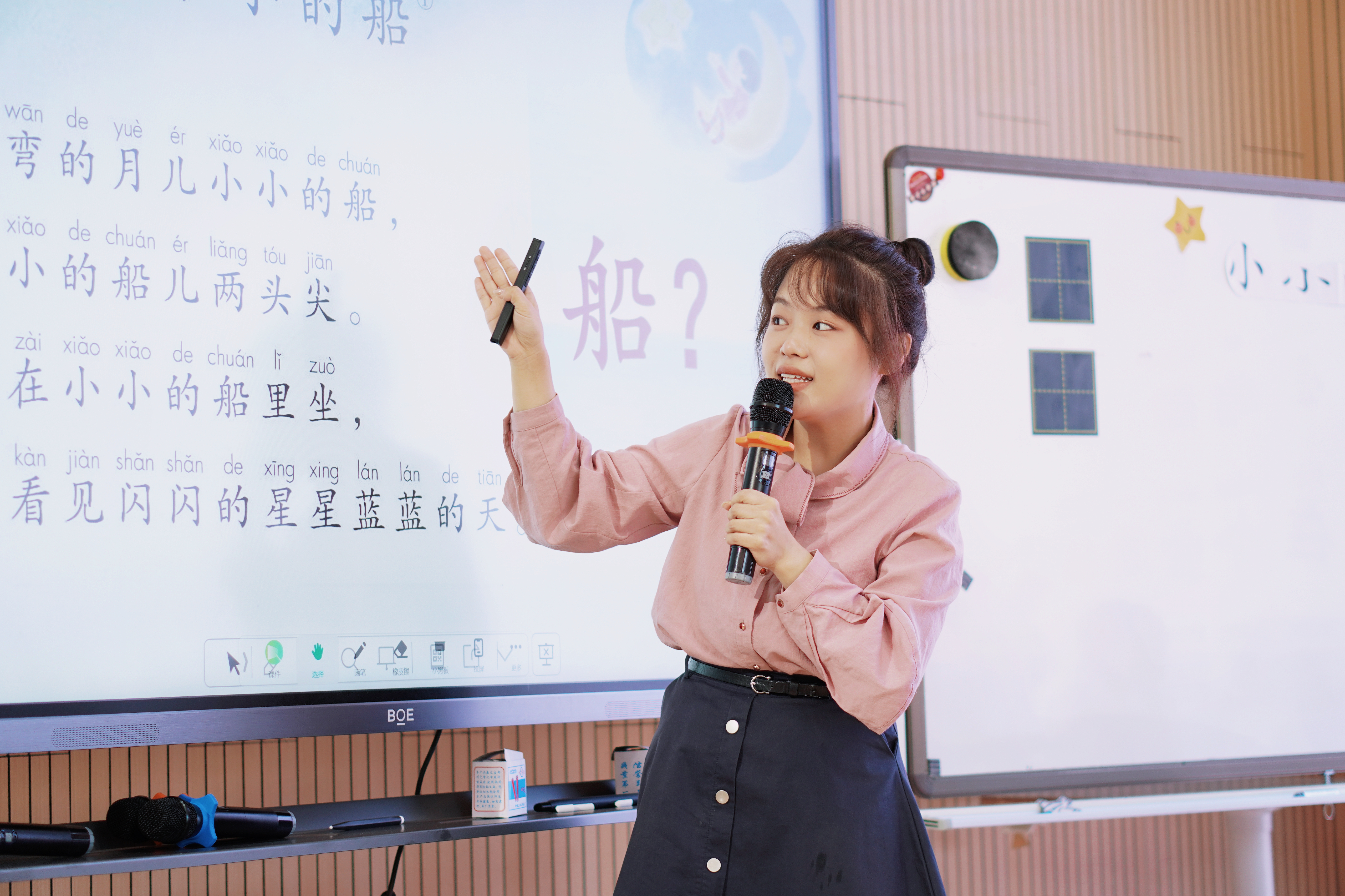 首先,由温州市蒲鞋市小学的郑烨烨老师带来了一上《小小的船》的课例展示。郑老师以甲骨文引入,将识字教学扎实落地,同时将儿歌中的叠词以形象的图片为载体转化为一个个语言训练点。课堂上,郑老师通过多形式的朗读,层层推进,让学生体会到了儿歌的韵律美。