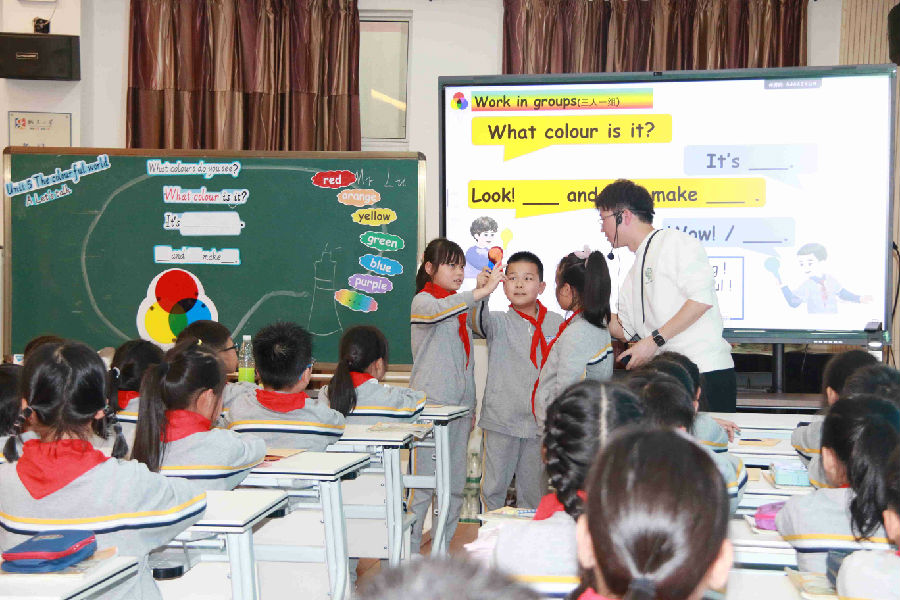 课堂伊始,徐老师便创设了Mr Jones为大家上美术课的情境,在情境中围绕A部分问题“What colours do you see?”,引导学生通过听、看、说、唱等活动了解不同颜色的英文表达,学习询问并回答物品的颜色,接着利用教具彩色透光片开展三原色混合实验,深入理解和演绎对话内容,最后通过完成“Let’s make more colours!”实验探究报告单活动,进一步了解三原色原理,提炼出“Primary colours make the world colourful”这一主题意义,为下一课时做好了铺垫。课堂中学生在好奇心的驱使下,有效使用彩色透光片这一教具,在探究和实操中不断验证猜想,汇报结果,顺利达成了各项学习目标。
