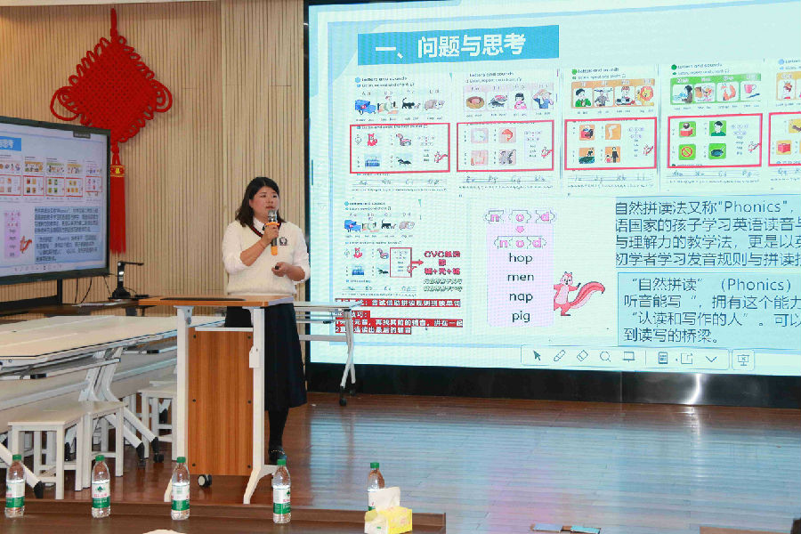 温州市平阳县麻步镇渔塘小学名师沈玲飞老师带来了一场《基于语篇的自然拼读教学实践》和《新课标视域下PEP新教材的新探索》的精彩讲座。首先,沈老师对比新旧教材,指出教教材正式引入了“Phonics”自然拼读,它是培养学生听说到读写的桥梁,教师要重点关注自然拼读课的学习,并提出指向新课标的拼读教学路径,以字母音、形、序展开,不断体验与验证,最后在语篇中渗透字母育人价值。沈老师表示上午两节课各有千秋,认为两节课符合语音课的特点,关注单元主题,发挥了语篇价值。此外,沈老师围绕新课标,新教材,新课堂,新挑战展开,强调教师应该以问题为导向,以综合为目标,以实践为核心,以评价为依托,关注学生语言的输出和思维的培养,发展他们的高阶思维,让他们用英语表达、传递中国文化、培养文化自信。
