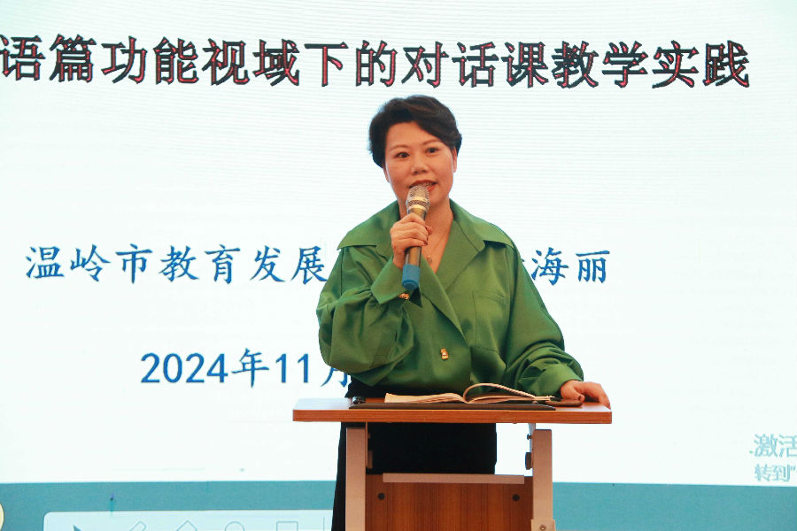 温岭市教育发展研究院小学英语首席导师黄海丽《语篇功能视域下的教学》,黄老师强调我们老师要知道语篇的四大功能:传递文化意涵;引领价值取向;促进思维发展;服务于语言学习,易于理解与表达。教师拿到文本后,要深入研读语篇,即从What、Why、How三个维度分析和阐述语篇的育人价值,聚焦目标语言,最终关注学生输出的东西。黄老师对今天的四节课表示高度肯定,并重点讲了下午的两节课,都遵循课堂Clear和Clean原则,有非常清晰的主线,上课老师根据三年级学生的认知水平,合理运用教材,结合单元主题,让学生学会目标语言,培养思维品质,渗透语言文化,培养学习能力。第二、课堂上以学生为主体,学生在课堂上都很开心,有充足的过程体验。黄老师留给我们一个思考:到底是先帮助学生理解语言还是理解语言传递的意义。最后,黄老师特别感谢远道而来的沈玲飞名师及其工作室成员,感谢她们带来这么好的课,带给我们很多启发。今天的研训交流值得大家去思考,去沉淀,去反思。我们要牢记几个核心词:大情境、大任务、问题链,聚焦目标语言,关注学生话语,让教—学—评伴随。