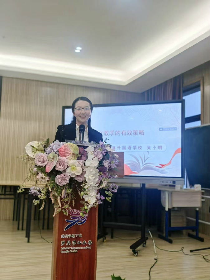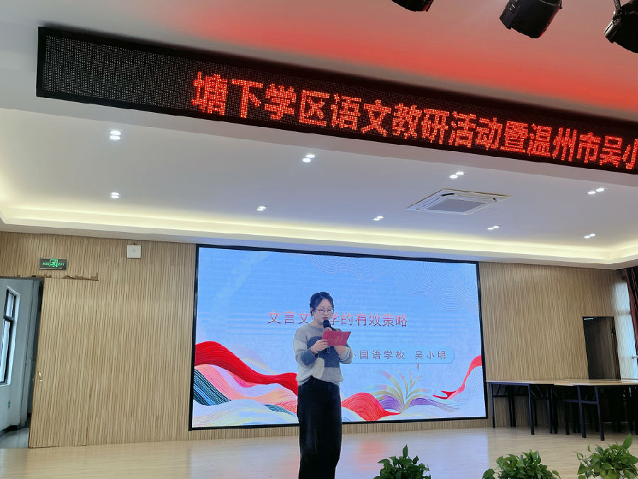 课后,温州市名师吴小明老师带来了主题为《文言文教学的有效策略》的专题讲座。吴小明老师针对目前文言文教学“相对陌生、不太好读、难以理解、缺乏趣味”的困境,带领全体老师一起寻根问题,寻找文言文教学的有效策略。首先,通过研读《语文课程标准》及新旧教材的对比,发现朗读在文言文学习中的重要作用。其次,吴小明老师结合具体课例分享了文言文教学的四条有效策略:以读为本,在反复诵读中了解内容;教给方法,在自主探究中理解内容;阅读链接,在拓展中感受传统文化;兼顾要素,在相融相生中适度凸显。最后,吴小明老师强调文言文教学要“一文一法”来落实语文要素,深入贯彻落实“新课标”的教学理念。吴小明老师的讲座为一线老师的文言文教学提供了具体的指导。