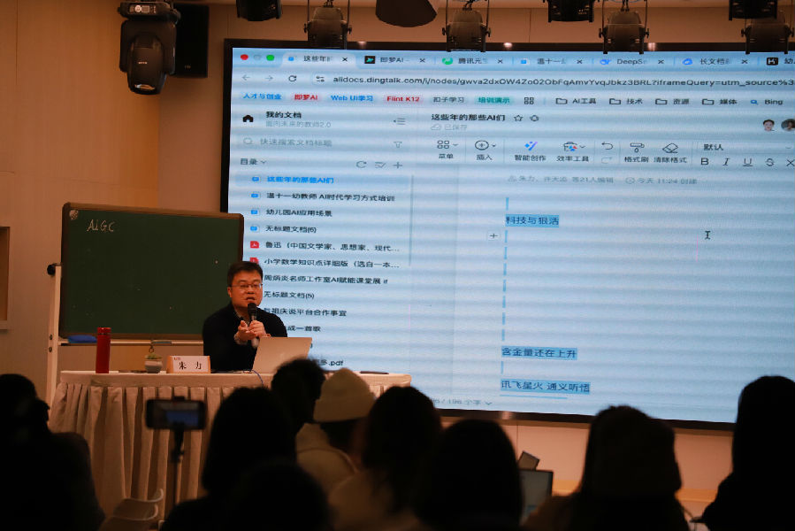 除此之外,朱老师还列举了其他AI平台,包括即梦AI、钉钉文档等使用频率较高的工具,引导教师们活用钉钉AI助理,开展教育教学工作。为了让教师更好地吸收和运用,朱老师还让参会教师现场演练,在互动中,教师们热情高涨,纷纷提出自己在描述提示词中的各种问题和疑惑,朱老师耐心倾听每一个问题,然后进行了详细且专业的解答,以此优化指令生成高质量教学资源。
