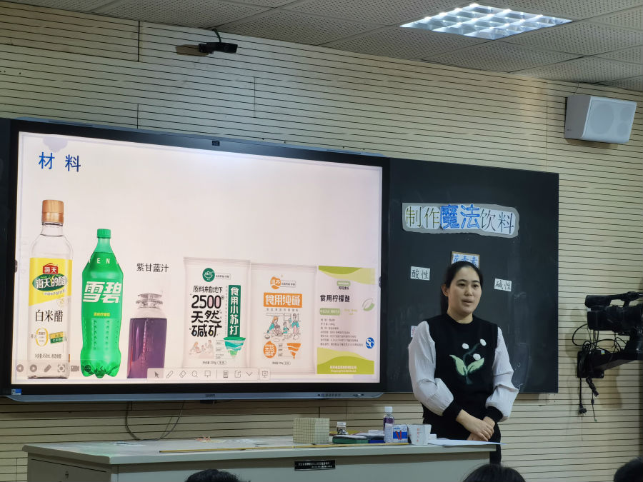 《制作魔法饮料》一课开始,徐玲玲老师通过播放紫罗兰变色的视频,引发同学们的好奇。随后,引入 17 世纪科学家波义尔发现紫罗兰变色现象的故事,引导同学们了解花青素的作用,并提出让紫甘蓝汁颜色变得与众不同的问题,顺利引出利用酸碱物质制作魔法饮料的主题。各小组热烈讨论,确定制作方案后,便分工合作,充分发挥动手能力和创新思维,不仅调配出心仪颜色的饮料,并撰写宣传语,最终投票评选出最受欢迎魔法饮料。这堂课将科学知识与趣味实验巧妙融合,激发了同学们对生活中科学知识的探索热情。