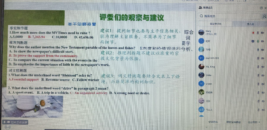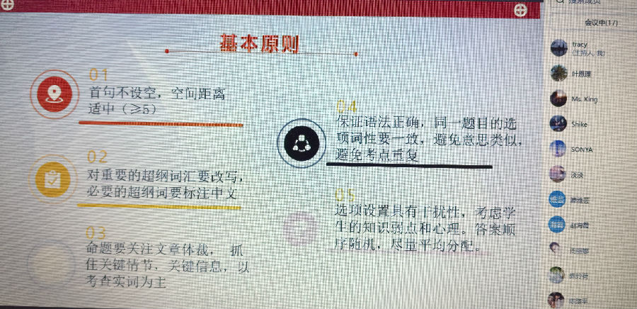 活动伊始,工作室助理张红叶老师系统梳理了本次命题大赛的评审情况。张老师从命题规范性、考查目标精准度、语篇改编适切性三个维度,对学员提交的命题作品进行了细致点评,并围绕“如何通过命题反拨课堂教学”这一核心问题,从文本素材的深度加工、试题情境的真实创设、能力层级的科学分布等方面提出了具有操作性的优化建议。