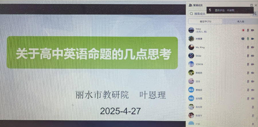 在专题引领环节,丽水市教育教学研究院高中部主任、丽水高中英语教研员、正高级教师叶恩理老师作《高中英语命题的理性思考与实践探索》专题讲座。叶老师以教师专业能力图谱为切入点,深刻阐释了命题能力在教师专业发展中的奠基性作用。通过解构“效度、信度、难度、区分度”四大命题质量指标,结合典型案例对命题原则的把握、核心任务的分解、双向细目表的运用等关键环节进行了专业解析。在实践指导部分,叶老师创新性地提出“学生命题者”理念,以阅读、完形、应用文题型为例,演示了如何通过命题活动培养学生的语言意识和思维品质,实现“以命题促学、以评价导教”的双向赋能。