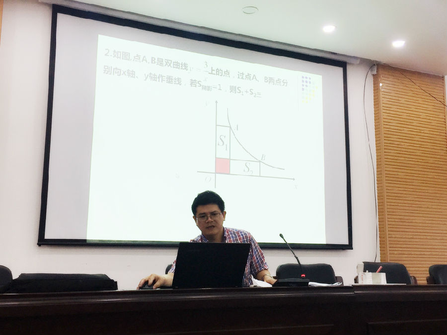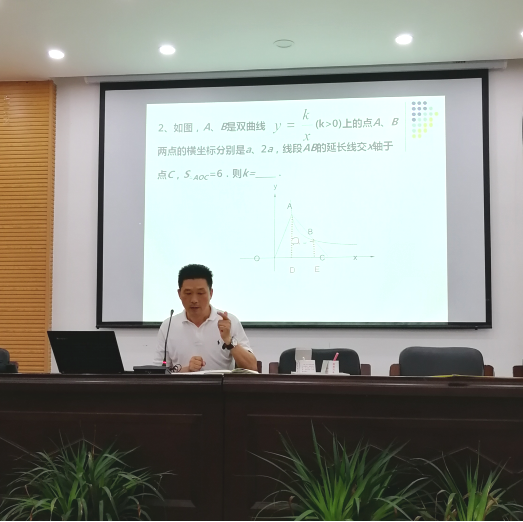 会议开始,首先由工作室主持人朱新余老师宣布了本次活动的主题“利用复习课查漏补缺、巩固基础,高效拓展提高”。担任此次执教任务的是文成县振中学校的鲁成来老师和文成县黄坦中学刘巧巧老师,他(她)们的课题分别是《反比例函数K值与几何图形的面积关系》《分式的运算复习》。两位老师向大家展示了风格迥异、精彩纷呈的复习课。观摩课后,温州市教坛新秀国培培老师、文成县教研员胡绍攀分别对两位老师的公开课做了精彩的点评。