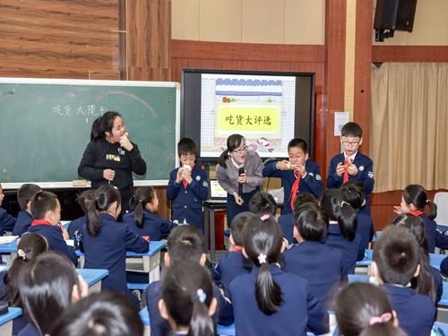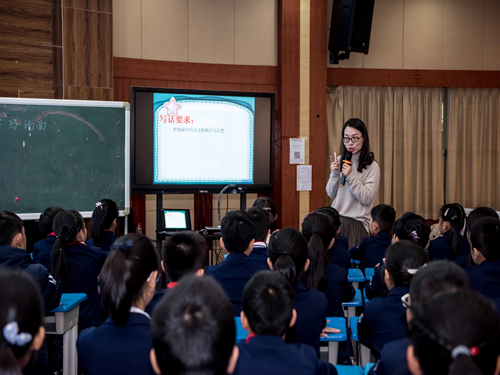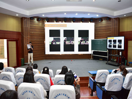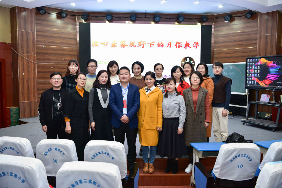活动初始,县实验三小黄方树校长致辞。他向在座所有老师表示热烈的欢迎,并对本次活动的开展表示大力支持。他介绍了学校的发展历史、办学理念,引用了“教育不仅仅要有意义,更要有意思”这句话要激励在座老师。随后,由东道主学校县实验三小颜彬彬老师与四年4班孩子带来课例《吃货大现形》。颜老师邀请到班级四位同学现场比赛吃鸡腿,让其他同学仔细观察,进行吃货大评选。加入微课,丰富课堂形式,通过二度修改让学生明白了习作的两大法宝。第二节课例由来自灵溪五小游青芳老师和四3班孩子共同演绎《学写场面》。游老师用一个拔河比赛的视频打开学生的思路,从把场面中的活动顺序写清楚,到借助微课例文学习“点面结合”,现场修改,二度习作,用好习作三招,扎实课堂教学。