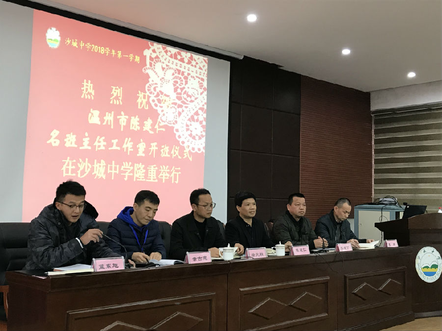 为了响应教育局号召,充分发挥优秀班主任教师的示范、引领、辐射作用,全面提升全市班主任队伍的整体素质,2018年12月12日下午,温州市陈建仁名班主任工作室开班仪式在温州市经济技术开发区沙城中学如期举行。经开区文教体工作局研训处涂元柱处长、沙城中学朱成丁校长、夏珺副校长、蓝东旭副校长、章吉忠副书记、政教处项光迪主任、陈建仁市名班主任工作室全体成员,以及沙城中学全体班主任共同参加了本次开班仪式。开班仪式由沙城中学德育副校长蓝东旭主持。