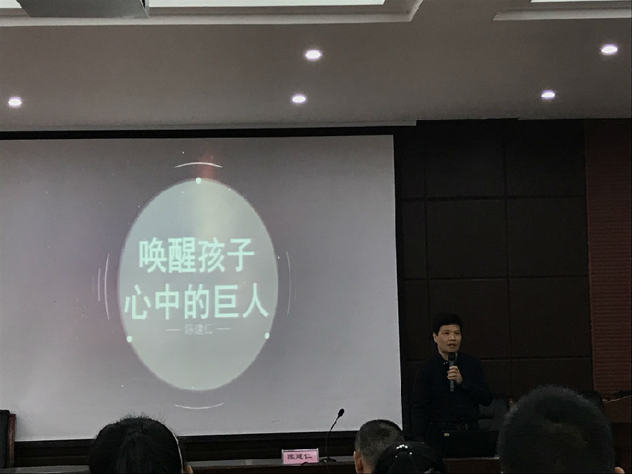 随后,工作室主持人陈建仁老师做了表态性发言。陈老师在发言中首先感谢各级领导的支持和信任,对工作室各位成员表示了热烈的欢迎和感谢,并汇报了本工作室未来两年规划目标和方向。他表示将充分发挥名班主任自身的专业引领作用,力争让工作室成为班主任研修的基地、交流的平台、辐射的中心,与工作室成员携手并肩,在班主任这项事业上描绘出精彩的一笔!接着,陈建仁老师做了精彩报告——《一生只做一件事——唤醒孩子心中的巨人》,他用真挚朴实的语言介绍了自己的成长经历和教育感悟,充分展现了一名德育特级教师个人的魅力。