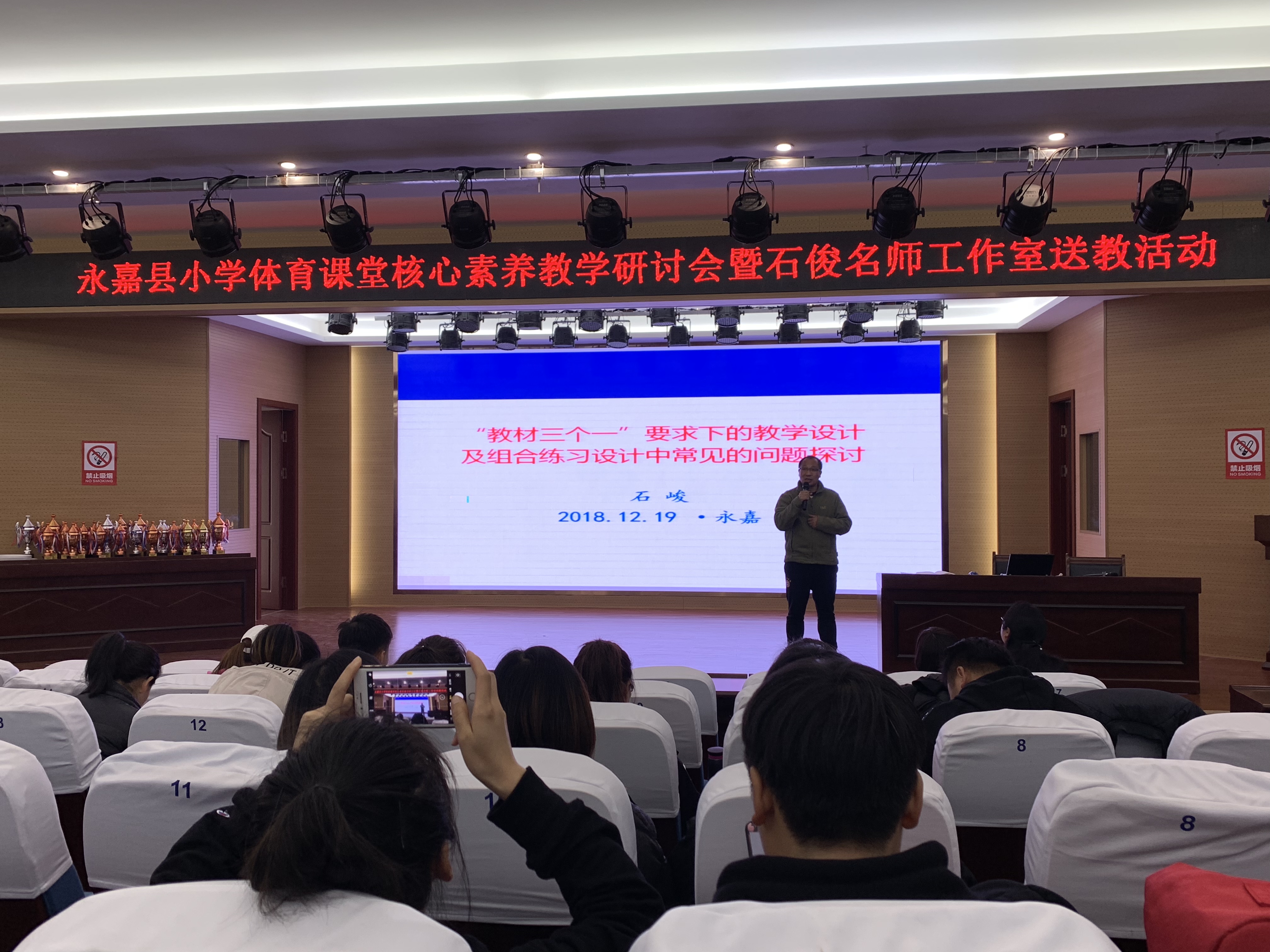 12月19日,温州市石峻体育名师工作室举行第22次活动暨温州市石峻体育名师工作室送教活动在瓯北第五小学圆满举行。本次活动由来自石峻名师工作室成员、永嘉县2018年新入编的全体体育教师、及瓯北学区部分骨干教师共60余人参加。