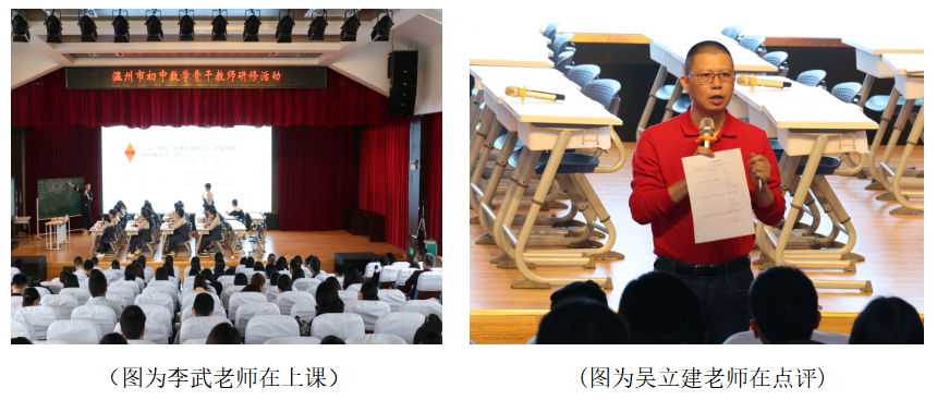 来自本校的青年教师李武老师带来了一节概念课——八下《菱形(1)》.给几何概念课的研讨提供了很好的素材。首先,他通过几何画板展示平行四边形的不稳定性,让学生从变化过程中寻找特殊的平行四边形,从而提出菱形这个名称,然后通过类比矩形的学习方法来探索菱形的定义和性质,李老师的引课直观、自主探索的思路明确,板书漂亮,性质运用中,例题采用变式,运用一题多解,对正方形的概念、性质以及判定得以巩固和落实。课后的交流点评环节中,在场老师也是表现出了肯定,而乐清市教研员吴立建老师则在点评中对本节课怎么进行设计进行了非常到位的指导。
