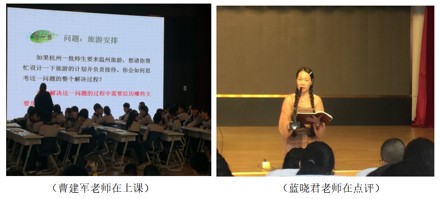 第二节课是由本次的特邀嘉宾给我们呈现,来自杭州江干区教育发展研究院的曹建军老师,他带来的是关于“课题学习”为大家展示教学,主题是《问题解决的基本步骤》,曹老师通过“问题一:如何旅游安排?”让学生感受问题解决须调查、沟通、计划、实施、回顾等环节,让学生体会到明确问题解决步骤的意义;通过“问题二:购火车票”,让学生明确问题解决的基本步骤,通过“问题三:话费套餐”,对比和统一问题解决的基本步骤和运用方程解决实际问题的一般步骤。曹老师上课“慢的艺术”一路贯穿,可重点知识贯彻到底,在与学生亲切有趣的交谈中,不忘拾掇学生的零散思维,及时汇集,鼓励学生。正如泰顺教研员蓝晓君老师所点评的那样“曹老师的课重点不在于让学生只明确问题解决的基本步骤,而在于让学生体验有序思考的重要性,所以也由此想到,曹老师不光在教学生要学会解一题会一类,也教导我们老师要通一课会百课。”这种思想让大家有了深刻的触动。