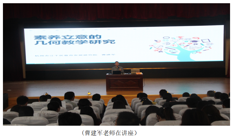 曹老师的课展示了大家风范,他的讲座也格外的引人入胜。23号下午,曹老师以《素养立意的几何教学研究》为主题的讲座,让我们再一次认识到了学科核心素养是育人价值的集中体现,现行的教育已经从教书转变到了育人为主,“为了知识的教育”转化为“通过知识获得教育”。讲座中,曹老师结合一系列的具体实例(如相交线的教学等)阐述了数学教学中要如何落实核心素养,为我们指明了落实核心素养的关键,同时要学会“示以学生思维之道”等观点,曹老师的讲座对我们的实际教学起了很好的引领作用。