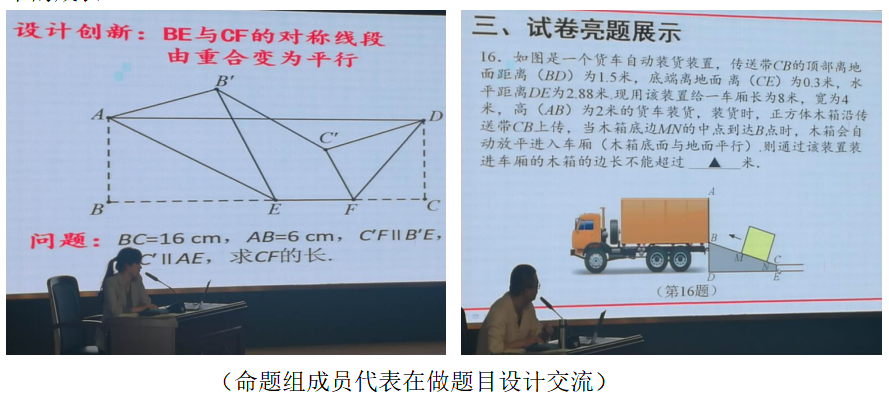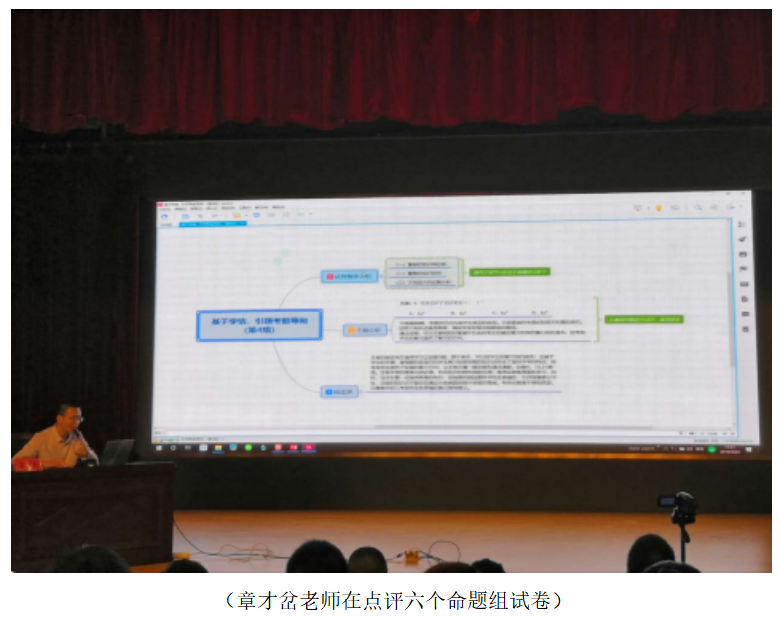24日上午,安排的是命题研讨。负责展示的是市命题研修班的六个小组的组长或成员代表,内容为中考模拟命卷成果,负责点评的是温州市的数学教研员章才岔老师。六个小组分别就自己组的命题的背景和试卷评析、试卷的亮点、命题的遗憾、问题中的文化背景、改编题目的方法与过程等方面对试卷进行了阐述,展示中,我们感受到了这些学员们磨题过程中的辛苦,但也感受到了他们友好合作的良好氛围,同时也见到了很多的亮题或亮题题组,更看到了他们在磨题过程中的成长。