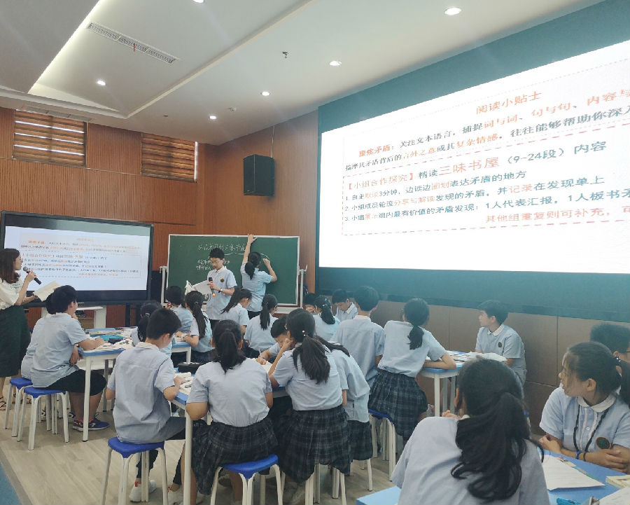 研讨会伊始,由朱清清老师执教统编教材七上第三单元的教读课文《从百草园到三味书屋》第2课时。朱老师通过“其中似乎确凿只有一些野草”“但那时却是我的乐园”引领学生扣语言,找矛盾,悟情感,并且在环节小结中学法指导的意识强,这为后面品读三味书屋部分内容给予了一种有效的示范引领。紧接着让学生参照“阅读小贴士”小组合作探究,通过小组分享、补充以及质疑,抓关键语句,体悟情感,最终抵达回忆性散文的情味核心。在学生积极的发言交流中,可以真切地感受到,学生读出了鲁迅三味书屋读书生活的独特,也读到了少年鲁迅的童真童趣以及成年鲁迅的深沉思考!