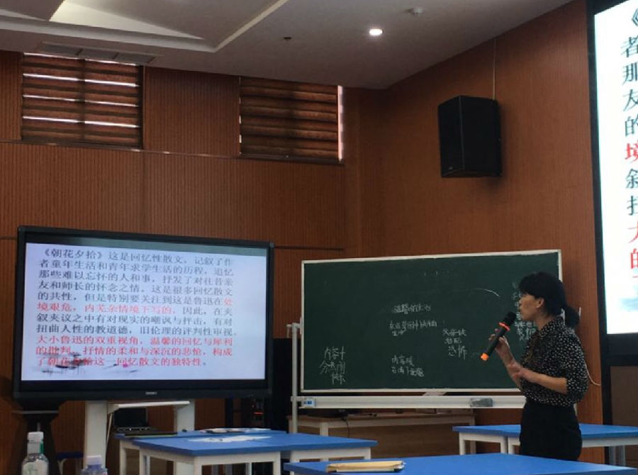 在评课环节中,永康中学的徐芳芳老师认为朱老师的《从百草园到三味书屋》契合第三单元的“双线组元”。本课时教学紧扣课后的思考题三,拓展题五,然后巧聚矛盾,在有效的小组探讨与交流中,领着学生往文本的更深处漫溯,体悟文本的“双重视角”,在思维的碰撞中突破了教学的重难点。此外,在教学单篇课文时,有意识地穿插,勾连整书阅读,名著阅读与名篇课文互相融合,自然呼应。王老师的《朝花夕拾》名著研读课,通过为上节课的“三味书屋”着色,让学生自然地走进了这堂课,一下子激发了学生研读的兴趣。紧接着“描绘色彩”环节的知内容,到冷暖色调分类的主题主旨探究,课堂是有意识地步步深入,并且有思维思辨的构成与提升!读经典,学思辨,当属阅读又一种境界,而这恰是读者与文本最佳的交融状态,只有产生思想的碰撞与情感的激荡才能实现阅读的更高层次的升华。除此之外,徐老师认为这两堂课在文本语言的回归上可以再强化下。