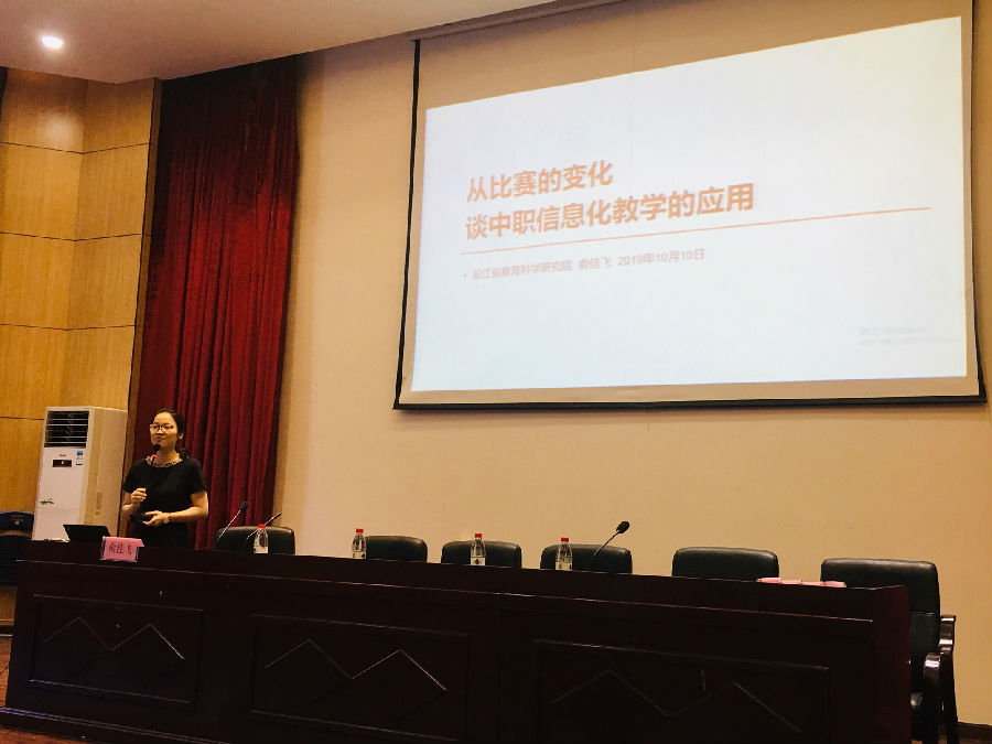 接着,浙江省教育科学研究院计算机教研员俞佳飞老师向大家作了《从比赛的变化谈中职信息化教学的应用》的主题讲座。俞老师分析了近几年信息化大赛的变化,重点分析了评比要素,强调接下来的信息化大赛更加注重配套提供丰富、优质的学习资源,更加关注技术技能教学重点、难点的解决,更加注重云计算、大数据、物联网等的合理运用,并介绍了2020年信息化大赛怎么比?比赛需要交什么?谁来比?挑战在哪?如何准备?俞老师的详细讲解让大家清晰了解了信息化大赛的巨大变化,清晰了备赛的思路。