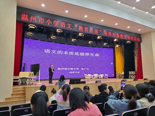 课堂教学之后,特级教师、道尔顿小学的朱广久老师作了题为《语文的本质是滋养生命》的专题讲座。朱特站在立德树人的高度,谈了自己对语文课程的认识,诠释了他心中理想的语文课堂。同时朱特指出,语文课固然要关注要素,但不能“唯要素”。既要尊重教材,又要敢于突破。语文课上要多一些心灵的自由,多一些诗意的浸润;少一些功利化、技术化,去一些匠气与俗气。