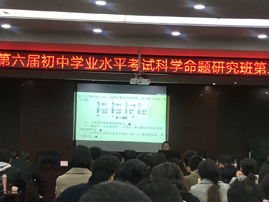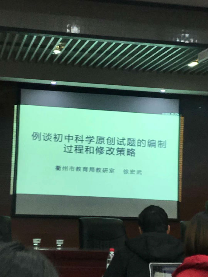 下午,徐宏武老师从初中科学教师参与命题的现状出发,鼓励一线教师多思考,要学会从教材、实验、科学史等方面挖掘素材,尝试改编和命制试题。徐老师还结合自身命题经历,详细的讲解了试题命制的步骤:确定测量目标、寻找剖析素材、设计核心问题、商定评分标准,在此基础上还需要反复的打磨定稿试题。