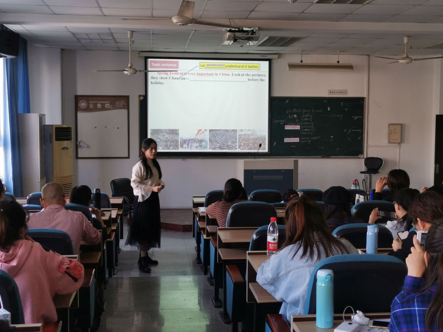 最后林杨老师带来了本模块的写作课,林杨老师在前两节的基础上,重点进行主题句和细节支撑的写作指导。同时,林老师提出了年味淡化和过年方式的演化这一现象,倡导学生传承和传播春节。林老师的作文课,既有对语言知识的复习,又有写作策略的指导,还有价值的渗透,最后通过评价表进行评分修改,为我们带来一堂精彩的写作课。