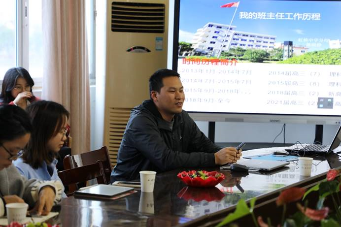 随后,盛旭仁名班主任工作室的四位学员解读和分享了自身的教育理念。陈晓静老师分享了自己当班主任这些年的历程变化,他是怎么一步一步用各种班会活动引导学生努力学习,培养团结一心的凝聚力,分享了一些成功的事情,学生是怎样尽力去取得荣誉,分享了活动照片,也提出了现在自己遇到的问题,参加工作室后的收获和如何解决;林彩丹老师分享了她开始带班后遇到的障碍、挫折,发现最后一届的班级第一名可以带动身边学生学习,明白了榜样的力量,懂得如何把握好师生之间相处的度;而邹攀老师的学生大都家庭条件不好,缺乏责任意识,对自己缺乏信心,他就努力树立同学们的信心,转变同学们的学习理念,教导他们快乐学习,高一做好学生工作,打好夯实地基。王禄老师以“立志”开头,学生拥有志向目标后,利用个人成绩表格等,帮助学生们更好查漏补缺。