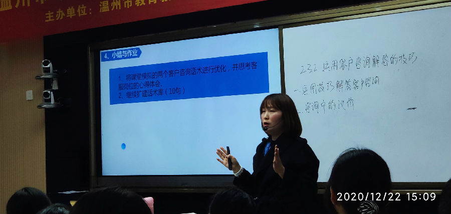 下午第二节课,是来自瑞职的毛晓宇老师上的《运用客户咨询解答的技巧》一课。毛晓宇老师以瑞职文创产品——白色帆布包实物引入,模拟客户对帆布包咨询的场景,针对客户提问分小组讨论回答,巧妙地引出客户咨询解答的技巧口诀。“找准原因,见招拆招”动画视频的运用将本节课推入高潮。学生通过个人练习和小组练习双重实战,熟练掌握了客户咨询解答技巧的运用。整个课堂各环节衔接自然,教师对课堂中信息化平台的使用自如有度,学生对课堂设置的任务解决和落实游刃有余,教学氛围十分融洽。