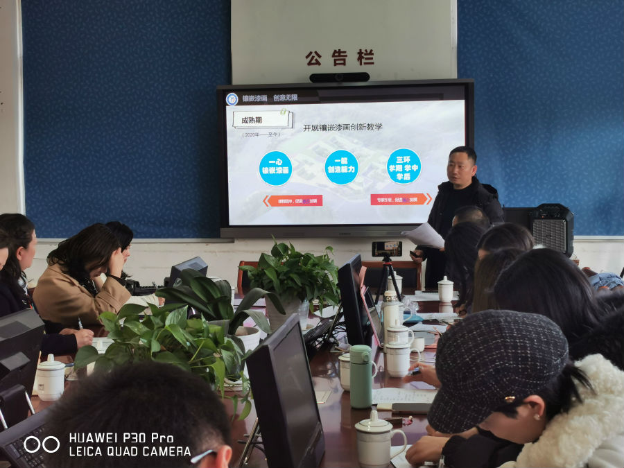 接着工作室成员做主题交流。上江小学孙文光校长做《镶嵌漆画 精彩无限--------特色项目推进学校特色建设》学校特色分享。该校自2014年确立镶嵌漆画特色教育,项目经过萌芽期、发展期、成熟期的积极探索,系统、深层次地挖掘和推广镶嵌漆画艺术特色教育,使学校镶嵌漆画艺术更加有深度、广度与厚度。6年来,学校镶嵌漆画教育成绩斐然,学校镶嵌漆画受到社会各界的广泛关注。