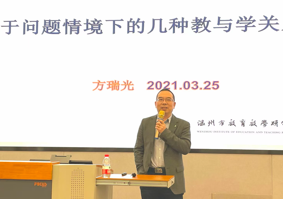 温州市化学教研员方瑞光老师为我们作了题为《基于问题情境下的几种教与学关系》。方老师的讲座由有效教学中的教与学,教与学的十种关系和基于问题情境下的教与学关系。方老师的讲座幽默风趣,他的讲座不仅对彭老师的说课进行点评,对黄老师的讲座内容进行反思,而且他还以自己的亲身经历向在座的年轻教师传授他对师生关系、教与学关系的理解。方老师的讲座“金句频频”,他告诉我们知识不是智慧,知识的迁移才是智慧;教与学的效益表现是有效知识量的增长等等。