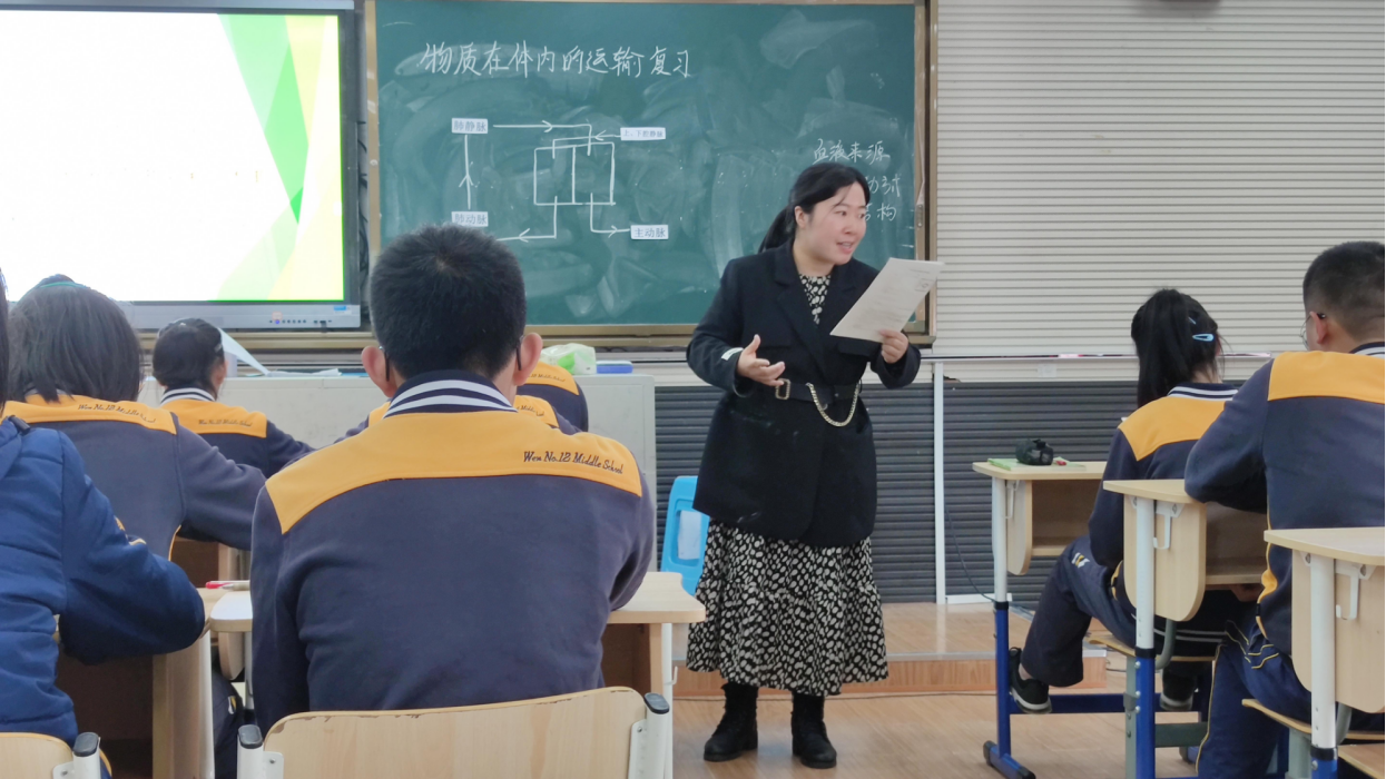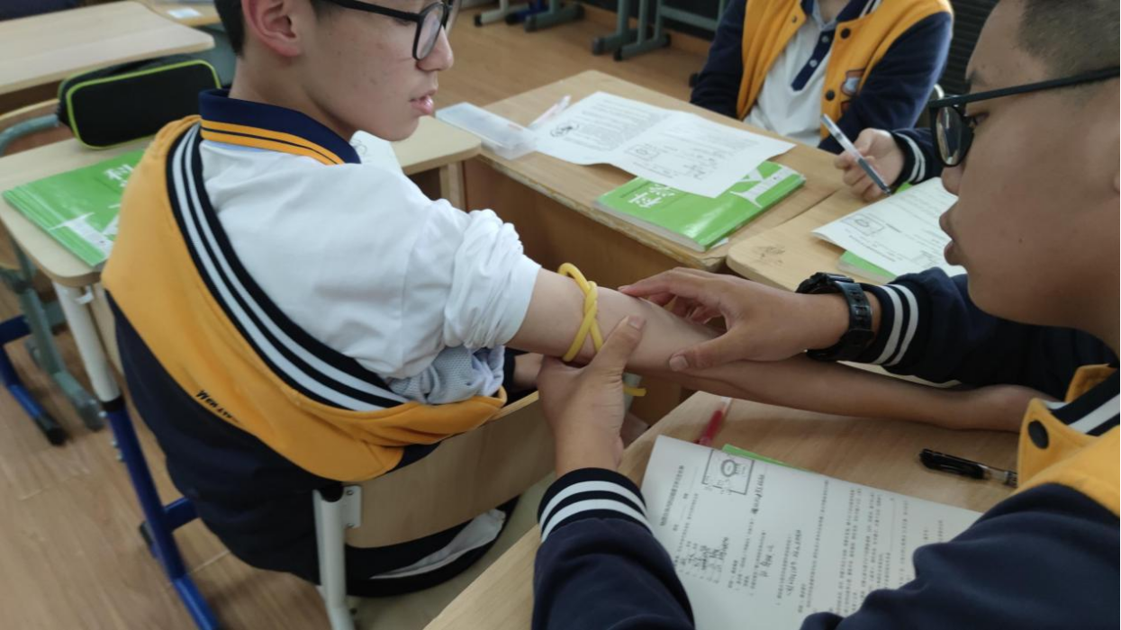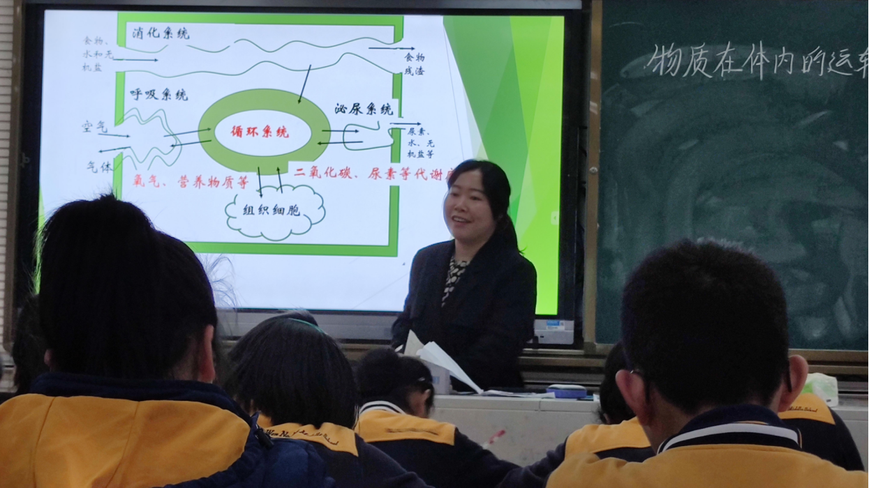 首先是刘日云老师带来的九年级复习课《物质在体内的运输》。刘老师先是利用模型图简单回顾了人体内几大系统协同工作的流程,随后便以科学史为线索展开了有关血液循环的发现之旅。刘老师通过让学生阅读材料,分别构建了盖仑的血液运动理论模型和塞尔维特的肺循环模型,并让学生用现有的科学概念辩证地看待两种理论的缺陷,同时,利用小组合作方式设计并验证了人体静脉中的血液是单向流动的,接着,利用哈维的结扎实验和肝脏造血否定假想等史料逐步构建出完整的血液循环结构图。整堂课中,无论是模型的构建,还是新老认知的辩证冲突,都是对学生科学核心素养的挑战与提升。