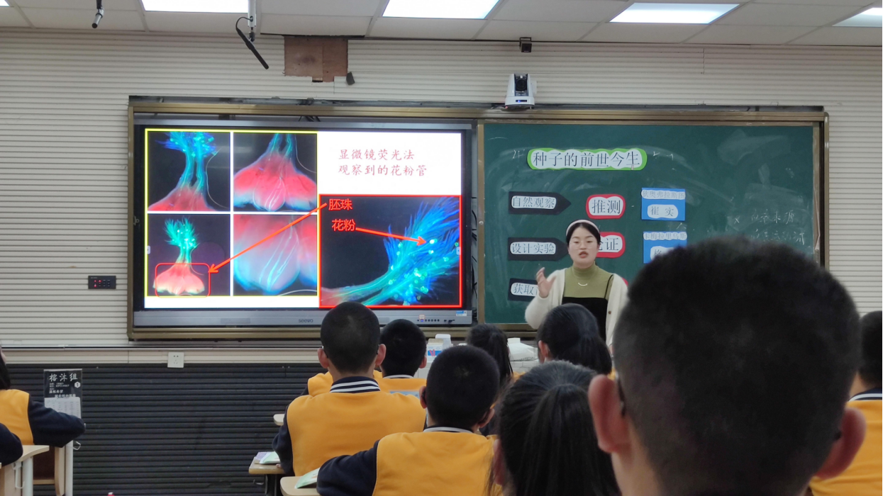 第二节是由黄婷婷老师带来的七年级复习课《种子的前世今生》。整堂课以如何更好的给大山中的孩子讲解种子的前世今生为背景展开。先是通过三个概念图复习了有关植物的生殖的相关知识,此后通过重历科学家们是如何从“植物是没有性别的”的宗教观到“植物存在性别之分,并能够利用有性生殖形成种子”的科学观的发现之路,期间不断地让学生从生活或科学的视角寻找证据去论证科学家们经历过的质疑,如用小组合作的形式设计实验验证花粉对种子的形成并不仅仅只是一种刺激,还是遗传物质的供给者。整堂课,在运用知识解决问题的同时,对学生的科学方法、科学思维、科学态度等方面的培养也有很大的触动。