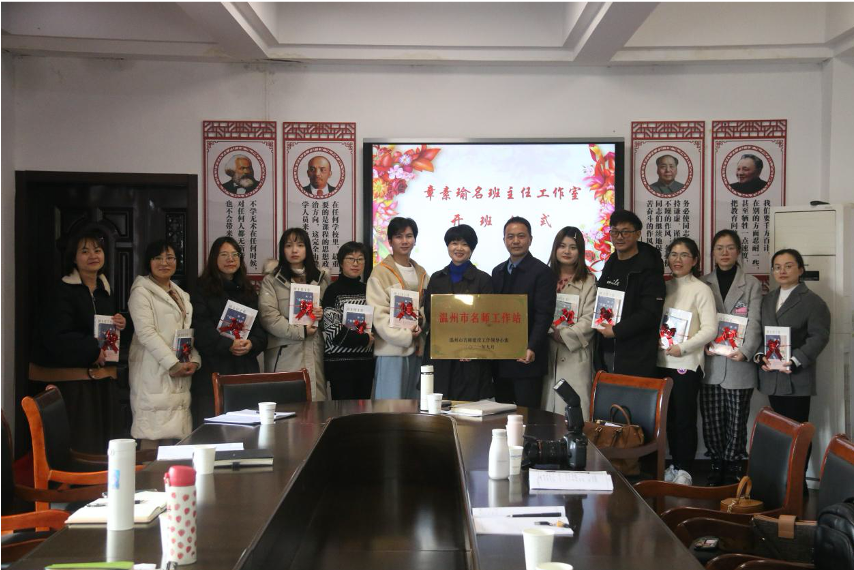 开班伊始,金乡职业学校校长黄开艮和温州市名班主任章素瑜共同揭牌,见证了工作室的成立,并为学员们颁发了班主任系列的赠书,希望所有学员能坚持读书,站在巨人的肩膀上,快速成长起来。