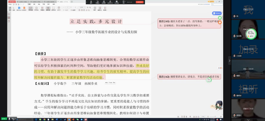 韩老师介绍摘要字数一般200字左右,控制在五行以内。第一二句交代背景,接着把达到自己目的的路径进行描述,最后一句写达成效果。结合学员们的论文,他强调先论点再论据,减少客套话和破折号等符号的出现。