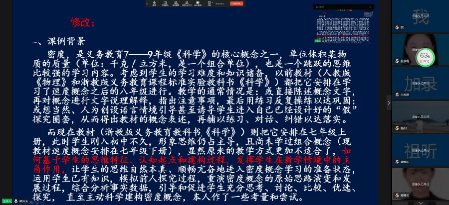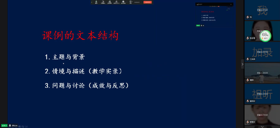最后韩老师概述了课例是基于教学实际问题或教学理念展开的教学预设和生成,要突出设计优势。它的文本结构包括三部分:主题与背景,情境与描述和问题与讨论。