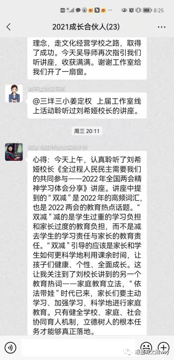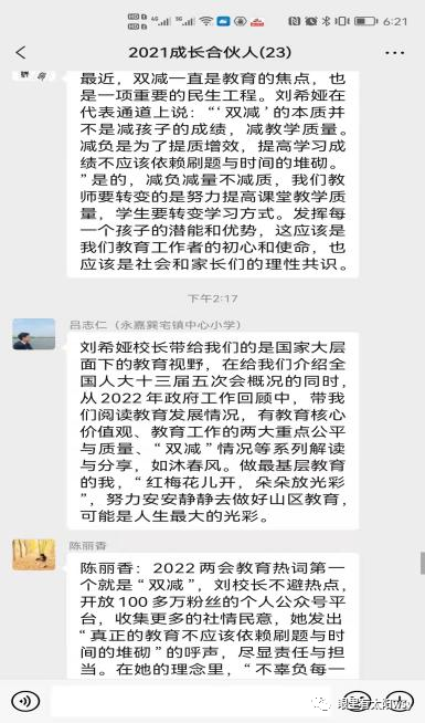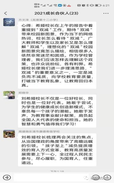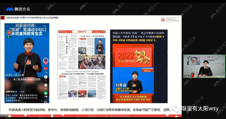 刘希娅校长还在线上和我们分享了她参加全国人大十三届五次会议履职情况及感受。她扎根基层教育,广泛深入调研,走访社会各界人士,和校长、老师、家长、学生们一起,讨论“双减”政策对大家的影响,听取意见和建议,汇聚民意,为民发声,提出了32条建议,其中,“学校不得利用周末节假日组织义务教育阶段学生补课”等多条建议都被立法机关采纳。“双减”是为了提质增效,减的不是成绩,不是质量,而是重构教育生态,回归教育本质,提升孩子的成长质量。一名来自基层的人大代表,能站在面向全国乃至全世界直播的代表通道的话筒前,借助代表通道将基层心声反映到治国理政的最顶端,这就是“全过程人民民主”的充分体现。