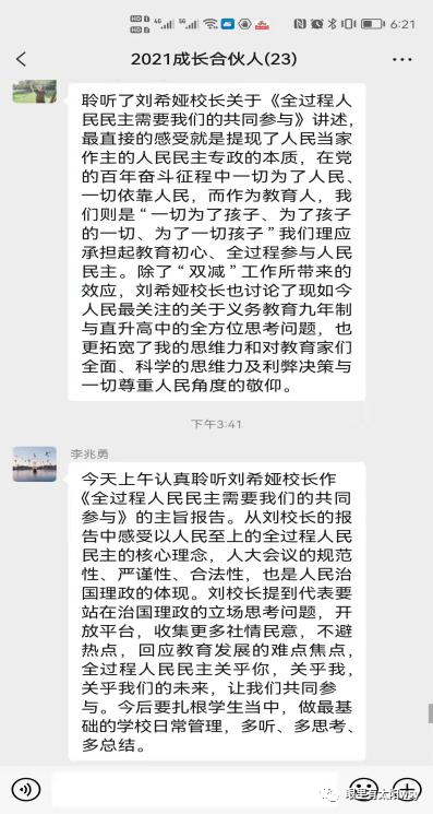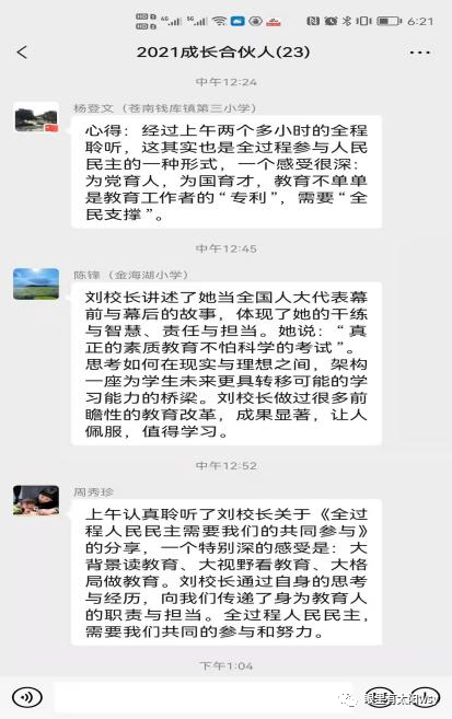大背景读教育、大视野看教育、大格局做教育。刘校长通过自身的思考与经历,向我们传递了身为教育人的职责与担当。全过程人民民主,需要我们共同的参与和努力。