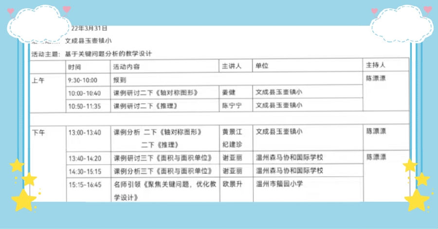 基地校安排2节展示课,分别是玉壶镇姜健老师执教的《轴对称图形》和陈宁宁老师执教的《推理》。再由温州森马协和国际学校谢亚丽老师送教1节——《面积与面积单位》。三位年轻老师都从学生的认知起点出发,认真研读教材,精心设计教学过程,让课堂精彩纷呈。