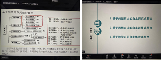 叶小芳老师所分享的主题是《小学数学单元整合教学的实践研究——以人教版五上《小数乘法》单位为例》。从内容上和方法上整合进行探讨,通过题目展示来充分说明单元整合能够让知识联系更清晰、让算法更有效、让数学思想得以培养。