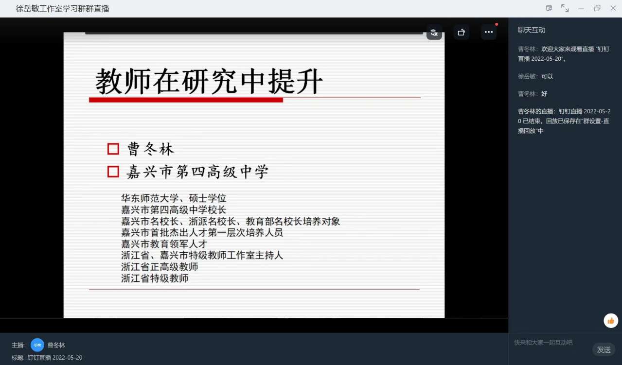 2022年5月20日下午徐岳敏名师工作室举行第8次研讨活动。出席本次活动的有来自浙江省嘉兴市第四高级中学的省特级教师、正高级教师曹冬林老师和工作室的全体成员。活动由正高级教师徐岳敏老师主持,共分为两个环节,环节一为工作室成员两位学员说课,环节二为专家讲座。