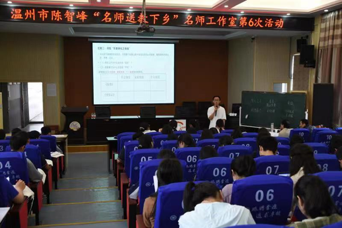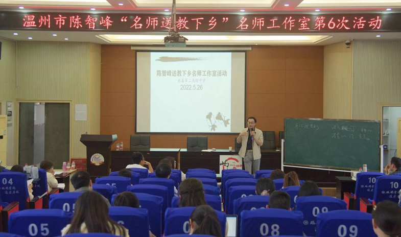 5月26日,温州市陈智峰“名师送教下乡”名师工作室第6次活动暨市名师工作室第18次活动在永嘉二中举行,本次活动围绕小说阅读与鉴赏展开,以三堂研讨课、一场专题讲座和一场点评提升的形式向听课老师多方位的展示了2021年浙江省教育教学成果二等奖课题——《高中语文“主问题·关键词”阅读课型的廿载探索》的研究成果。参与本次活动的有永嘉二中语文组教师、永嘉各校教师代表和永嘉县全体高中语文新教师共60余人。温州大学洪之渊教授作为本次活动特邀嘉宾也出席了活动并作了重要讲座。