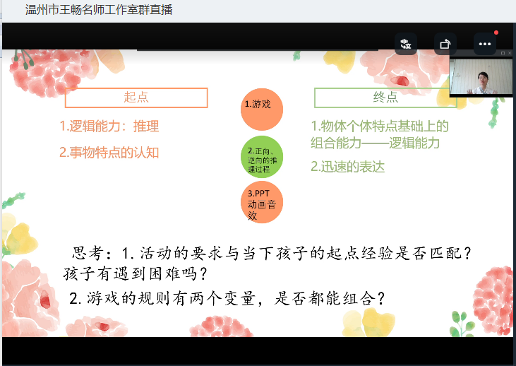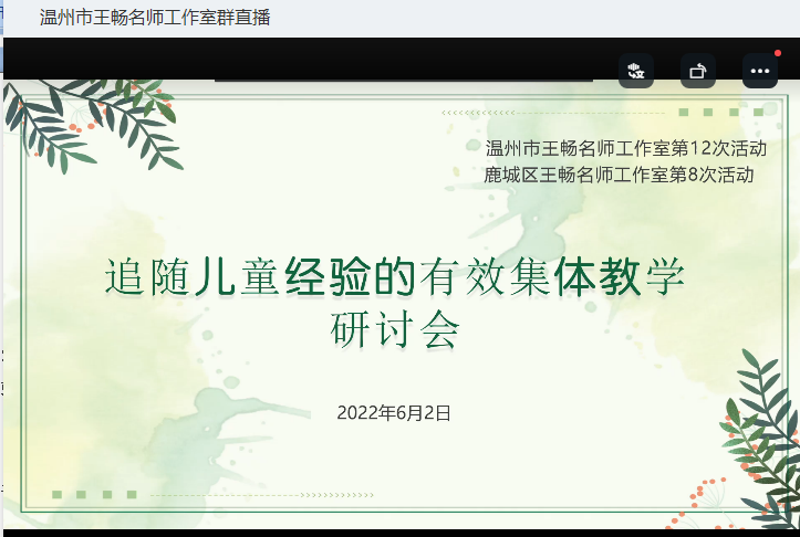 为了进一步提升学员追随儿童经验的语言集体教学活动设计及听评课能力,2022年6月2日,温州市王畅名师工作室通过钉钉平台开展了题为“追随儿童经验的语言活动设计”研讨活动。