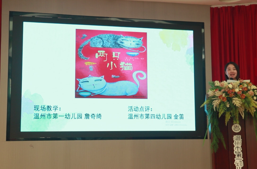 首先是温一幼詹奇绮老师为大家带来的大班绘本活动《两只小猫》。老师引导幼儿对绘本画面进行观察,从而唤起幼儿对绘本人物的形象、关系和故事情节的大胆想象、猜测及讲述,逐步建立积极悦纳、宽容大度的交往意识及健全人格。活动结束后,来自温四幼的金笛老师从“绘本的选择与细节处理的教学策略”、“大班幼儿语言核心经验的拓展”、“绘本哲学主题的传达”三个方面对本次活动展开了点评。