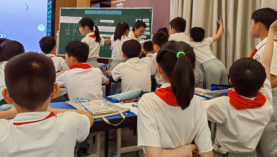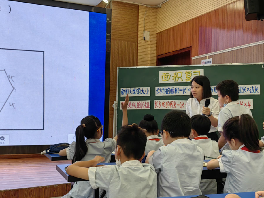 首先分别由温州市九山学校吴雨笛老师和永嘉县桥头镇朱涂小学盛晓秋老师带来的两节复习课《面积的整理与复习》和《小数的意义与性质复习课》。吴老师从点、线、面的关系入手,引导孩子对面积和周长进行了回顾,接着通过对算式4×5以及6×2+5×2所表示的图形展开想象和绘图,深入理解面积的概念,最后通过数字“16”表示相同面积求周长和相同周长求面积,深刻理解面积与周长的联系。盛老师的复习课从搭配“3、3、0”组成不同的小数进入课堂,通过对组合成的不同小数进行深入的回顾和探讨,引导学生从小数的意义、小数的计数单位、小数的大小比较等方面进行复习,最后她提出:“如何让3.3>3.30?”这一问题引爆了学生热烈积极的探讨。