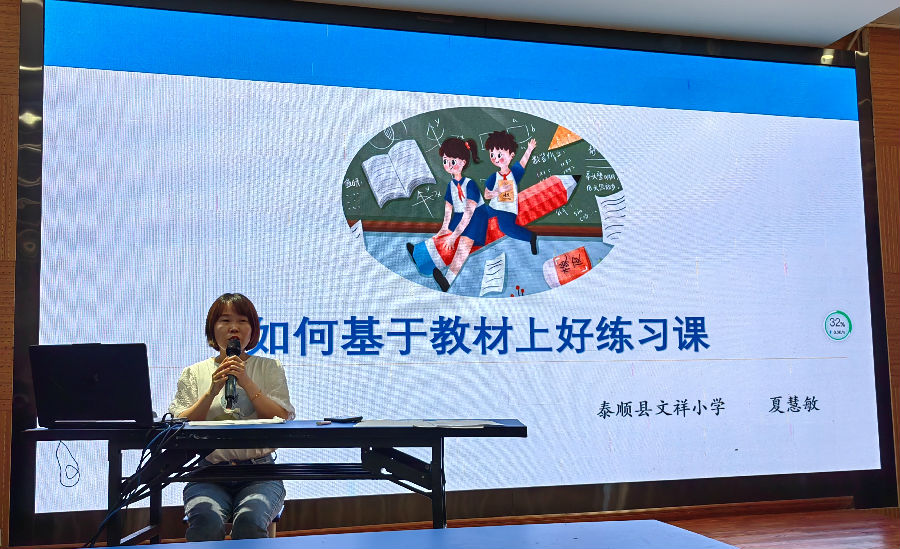 接着由泰顺县泗溪镇九峰中心小学张丽君老师和泰顺县文祥小学夏慧敏带来专题观点汇报《明确目标,有效复习》和《如何基于教材上好练习课》。