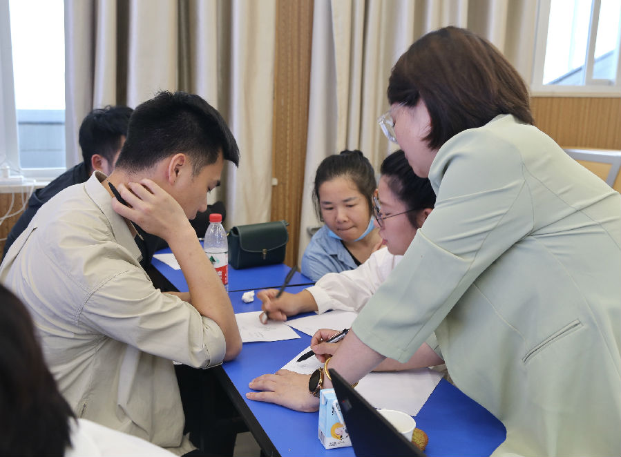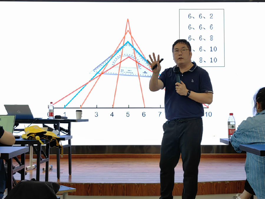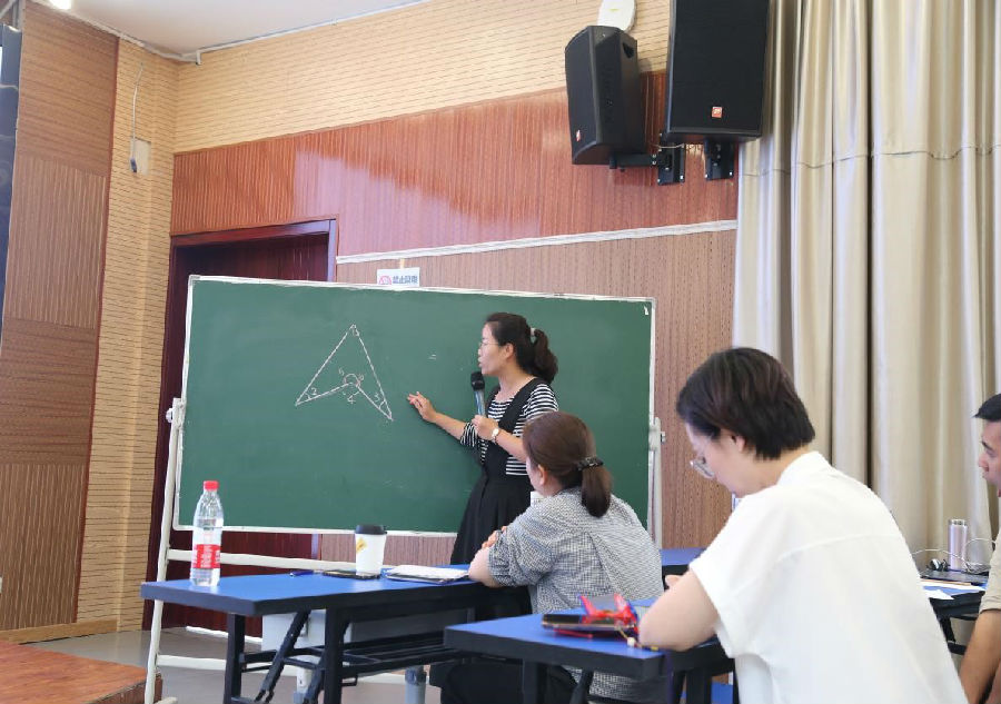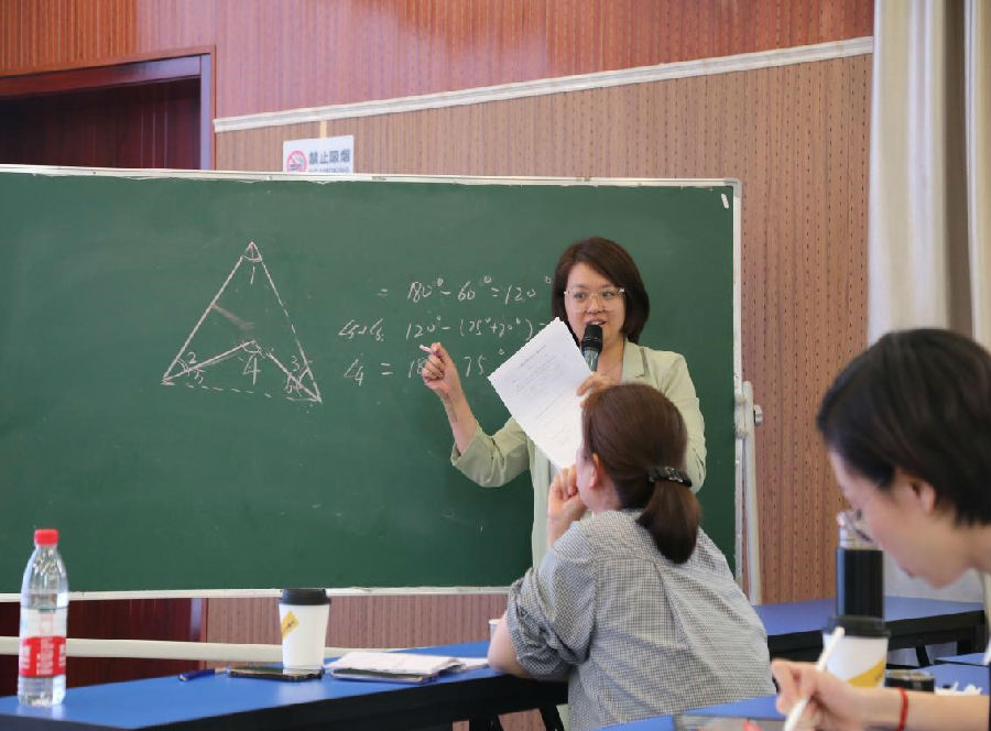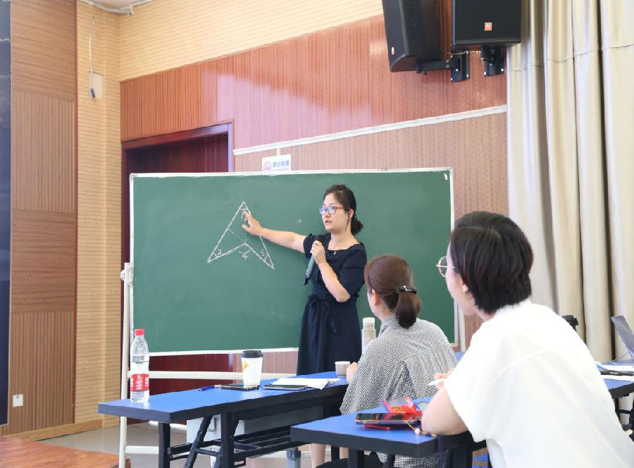 讲座的最后,王老师以一道挑战题:“(凹四边形)∠1=60°、∠2=25°、∠3=20°,求∠4的度数。”引燃了在座学员的思维风暴,学员分为4组积极讨论、相互学习,纷纷就此题发表了自己的看法,引得了在座学员和导师的喝彩。