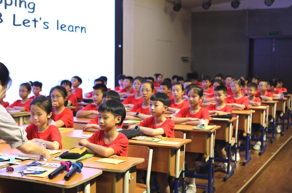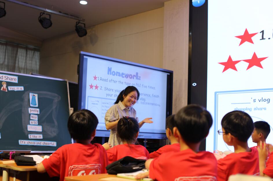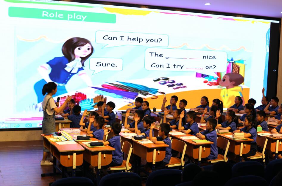第二节课,特邀温州市优质课一等奖获得者、北外温州附属学校戴俊敏老师和四(3)班的同学共同展示B Let's talk一课。课堂由一首新颖的自编歌曲Shopping引入,迅速让孩子们进入了高昂的学习状态。在真实的师生交流以及深度挖掘的课本Shopping场景中,戴老师创设了别具一格的问题,激发孩子们积极思考。丰富生动且饱含思维品质的回答,时不时引来与会老师的笑声和赞叹声,将本课学习推向了高潮。戴老师动静相宜的姿态、地道富有磁性的语音、幽默风趣的语言,给在场师生留下了深刻的印象。