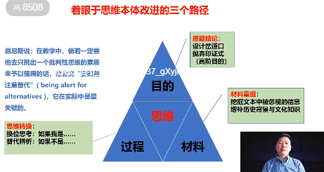 温州人文高中的瞿乐晶老师则认为余党绪老师以批判性思维为基点构建与核心素养相适应的新学习方式,在理论层面深刻分析了思维三要素:目的,材料,过程。这的确能帮助我们在日常的思维过程中,更全面地看清问题,以提高我们的思辨能力和理智美德。余党绪老师用“完璧归赵”的案例为我们深入浅出地提出了一些惯性思维以外的新角度。对蔺相如人物的质疑、对秦王历史形象的补充、对蔺相如行为的争议性评价等等,掺杂了更多超越时代也超越常性单一思维的分析,思辨性阅读可贵的品质是全面、综合、系统的分析与论证,在探索真知的道路上,思辨带来的思维成长是具有重要意义的。