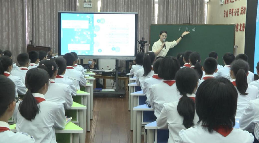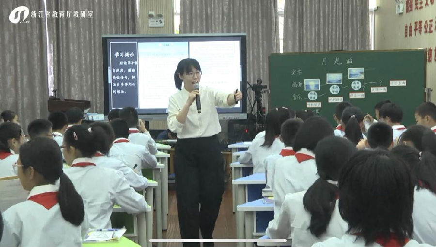 工作室成员温州永嘉县外国语实验小学的徐碧碧老师和温州乐清市北白象镇第五小学黄博丹老师以“1+X”联读理念教学统编教材六年级上册第七单元《月光曲》。
