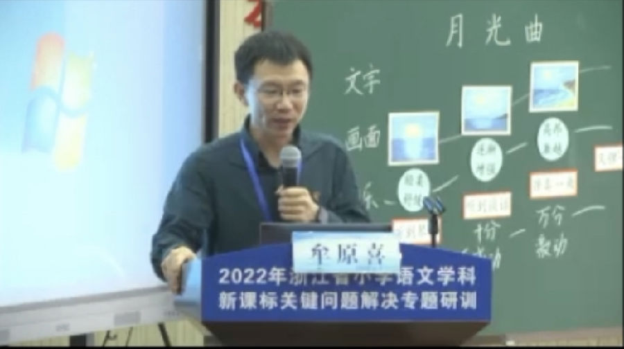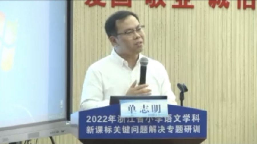 温州永嘉县教师发展中心研训员特级教师单志明老师做题为《六上第七单元内容解读与教学安排》的单元简述。单老师以横向解读本单元的内容,以纵向关联语文要素,明确了本单元的价值定位。再从单篇到单元,从要素到素养,从测评到展评,指出单元的教学应构建组块,驱动学习任务,促进学评一致。