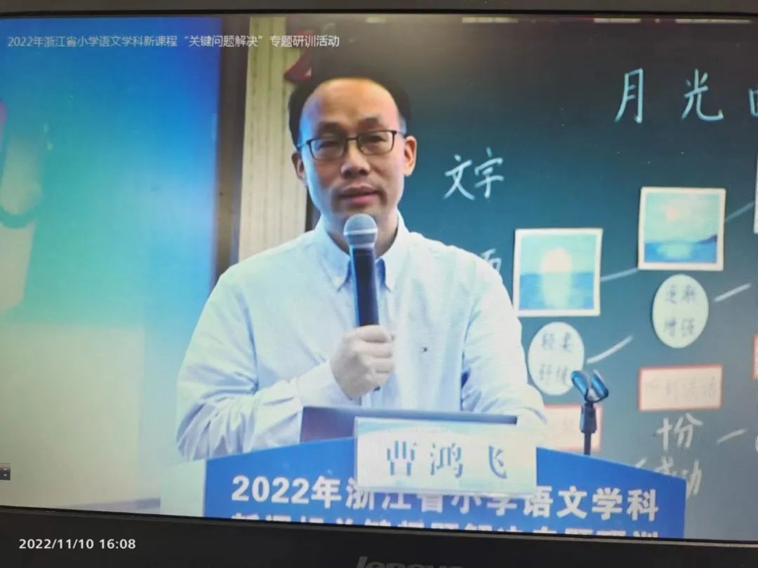 温州市教育教学研究院小学语文教研员、特级教师曹鸿飞以《依托语文教材实施语文新课标的教研思考》为题,与老师们分享了温州地区在新课标理念下的研训工作经验。曹老师指出实施新课标的思路应注重素养导向、整体思维、问题意识、实践取向,应依托语文教材实施语文新课标,不可完全脱离教材搞学习任务群教学,以立足育人、课时赋能、强化实践、重构作业、突破读写、评价赋力等方面系统落实新课标。