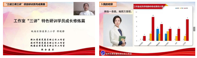 第三项活动由我们的黄笑蕾导师进行了《工作室研训项目计划解读》专题讲座,导师从研训目标、研训设计、研训做法、研训成果、研训梦想等五个方面讲述,让我们明白了工作室“三阶式”研训路径,了解了“三课三讲”的研究点,感叹于导师的“学员成长手册”为经、“三读”为纬的精妙设计,为我们的专业成长拨开了云雾,指明了前进的道路。特别是导师与共享的第二期学员的优秀成果时,更是令人震撼,学长们的成果中不仅有温州市名班主任的获得者,也有浙江省中小学班主任基本功大赛特等奖获得者,各级各类成果达253人次。近2个小时的讲座,蕾蕾导师没喝过一口水,偶伴有咳嗽,导师在身体不适的情况下却一直坚持着为我们指导,她的执着与热情无不感染着我们每位学员。